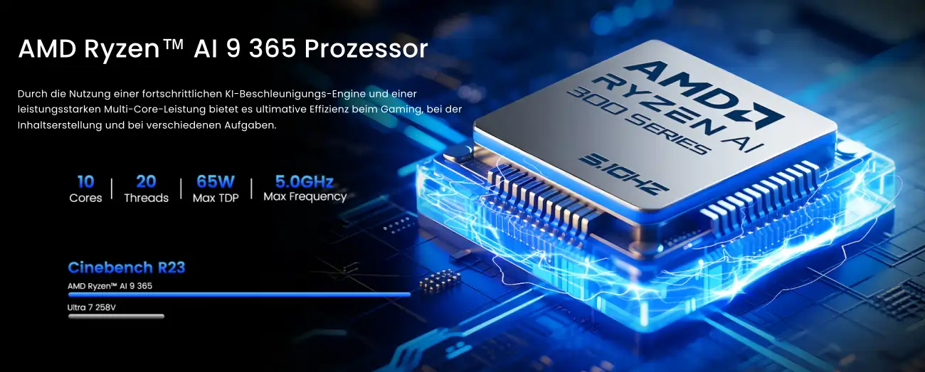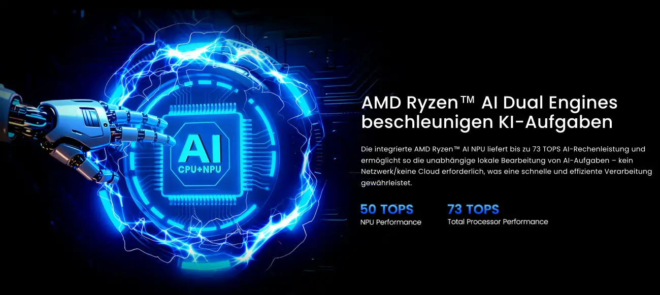AMD Ryzen AI 9 HX 365 CPU + Ryzen AI NPU Dual-Engine, insgesamt 73 TOPS