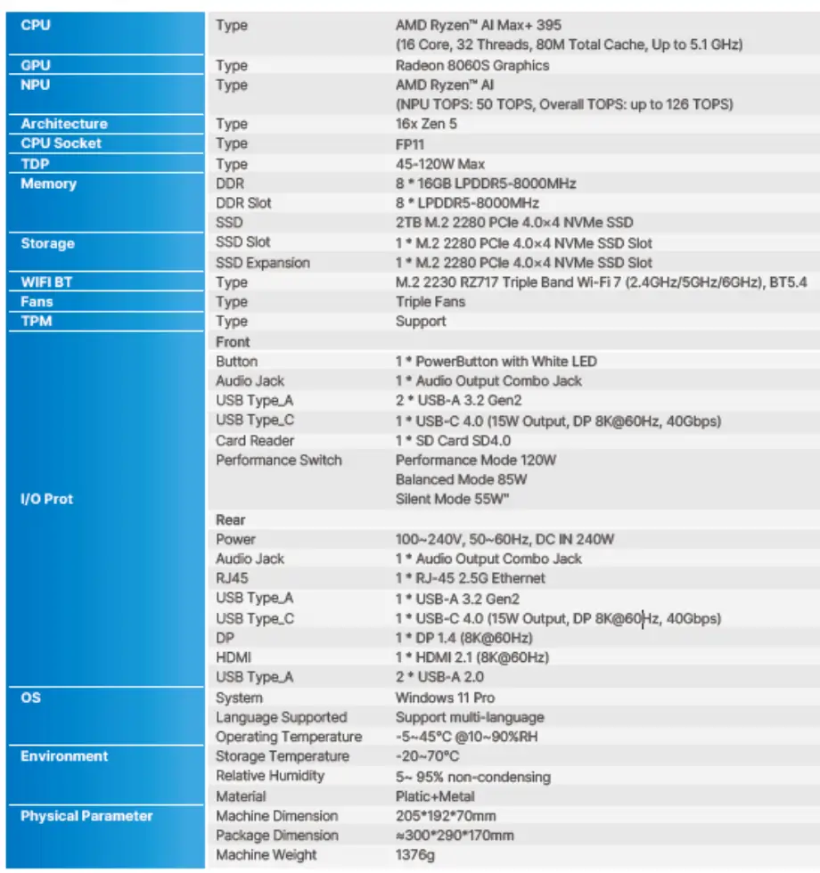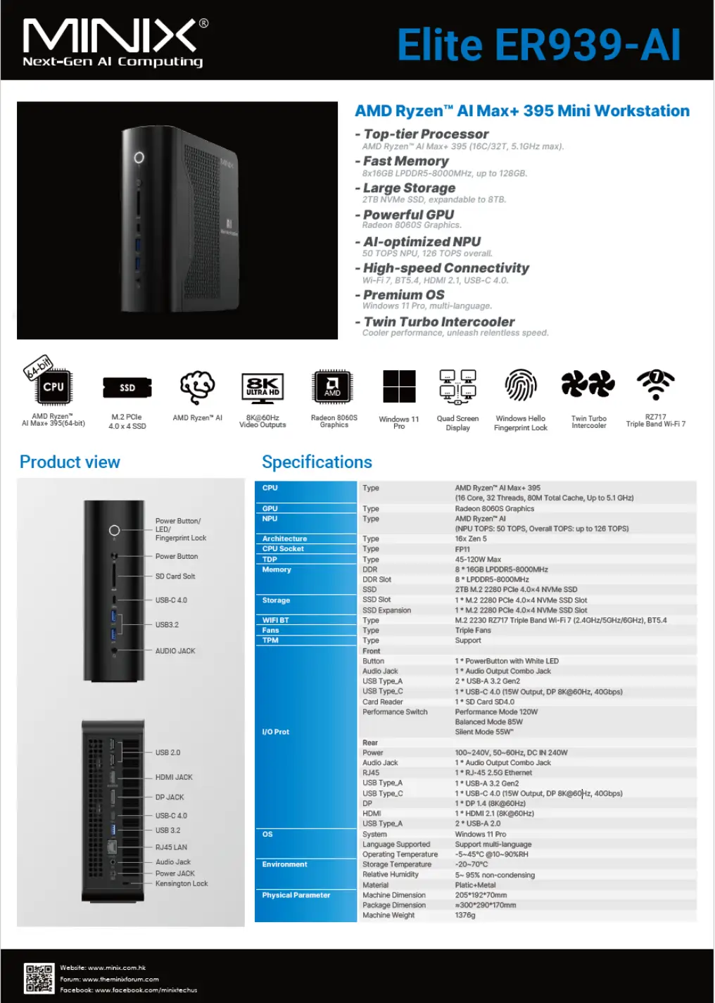 • MINIX Elite ER939-AI (AMD Ryzen™ Al Max+ 395) mit 128GB DDR5-8000MHz RAM und 2TB SSD