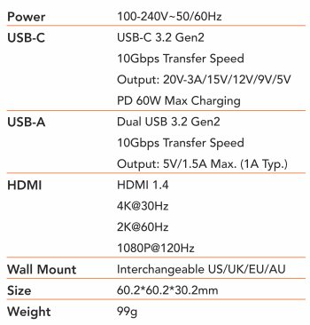 Anschlüsse: - 1x USB-C: 5V~2A, 9V~2,45A, 12V~2,58A, 15V~2,6A, 20V~3A (Volle Funktion: Aufladen, Daten, Video)